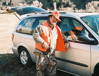 My friend, Chuck Farnsworth, and I have started what we hope will become a tradition: Wandering around in the mountains each 3rd season in hope that an elk will make the mistake of wandering off private land. Chuck and I have been friends and played music together since about 1993. This particular season, there was a terrible incident where a herd of elk was shot up by some hunters that did wrong. We think that the wildlife rangers felt sorry for a couple of "old guys" hunting on foot. The gave us one of the downed animals but we had to haul it out. It was downed about 3/4 of a mile off the road and it was no easy chore carrying it out by hand. We did half of it by hand and had to admit to our ancientness and call for some help from Chuck's son, James.